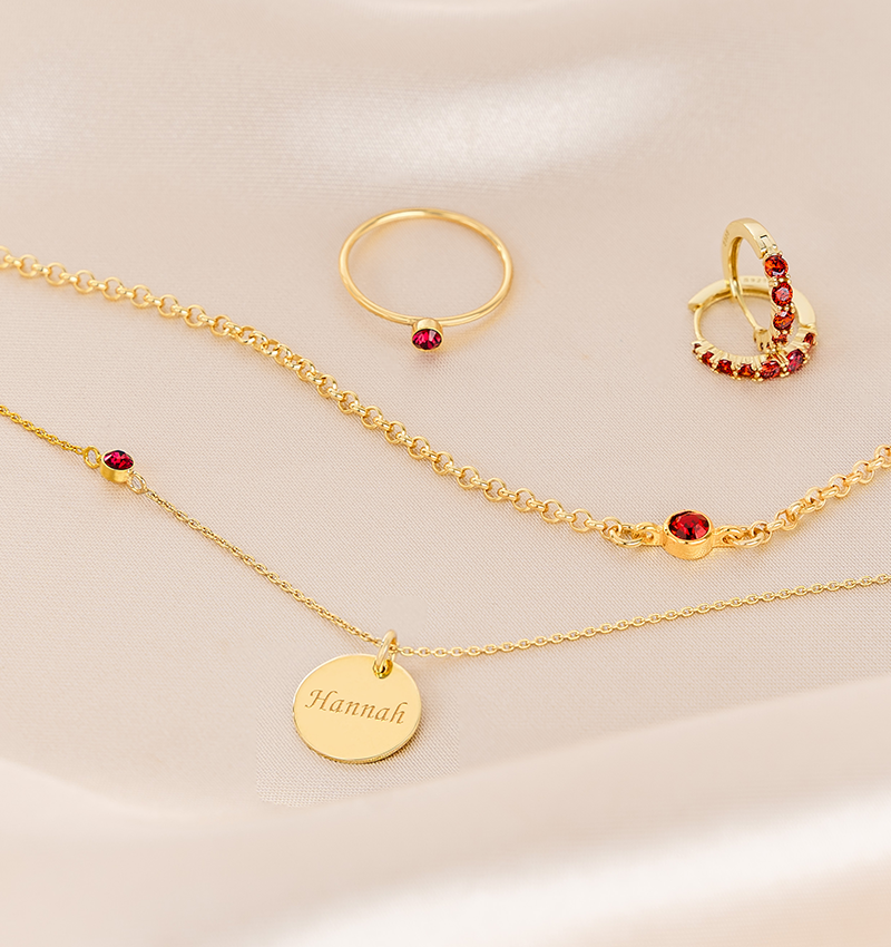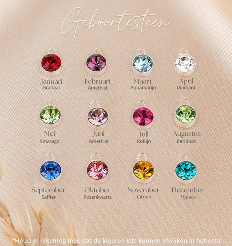 ♡ Voor dit sieraad gebruiken we zirconia kristallen waarvan de kleuren zijn geinspireerd op de oorsprokelijke edelstenen. Zo is Januari donkerrood, de kleur van Granaat.