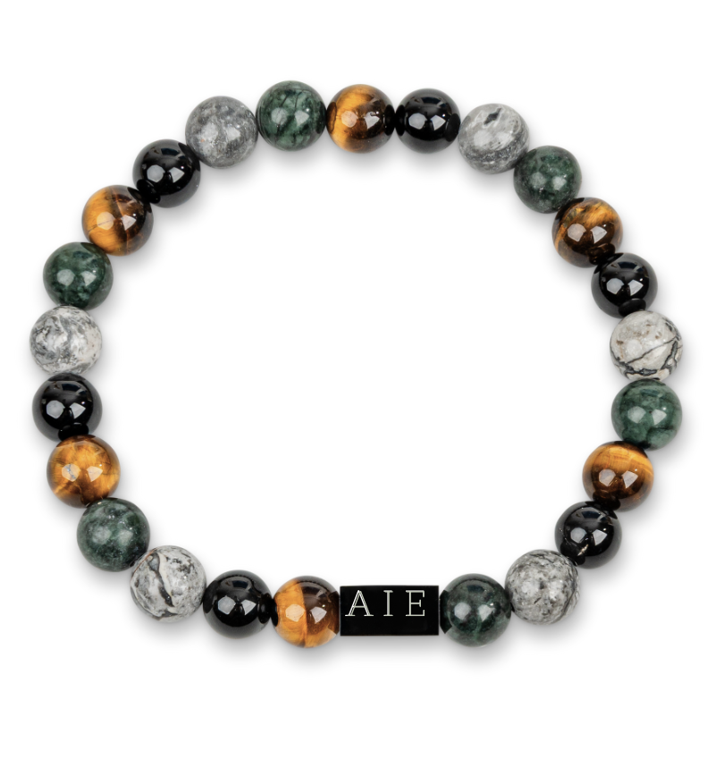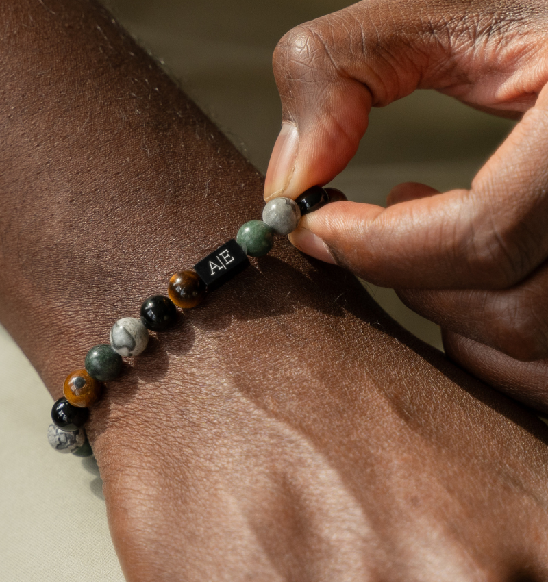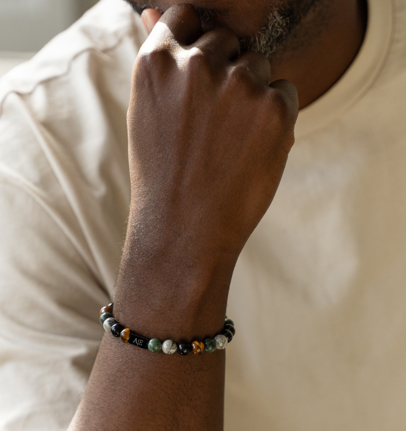 Een stoere mix van edelstenen en een gegraveerd blokje maken deze armband extra speciaal. Handgemaakt met duurzame materialen die een leven lang mee gaan.