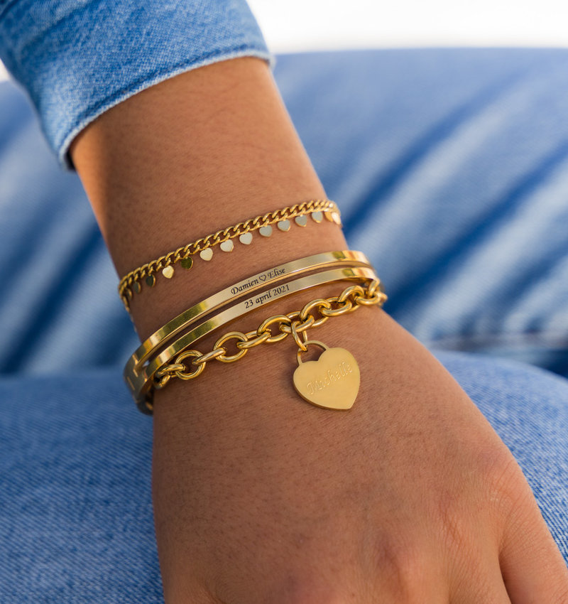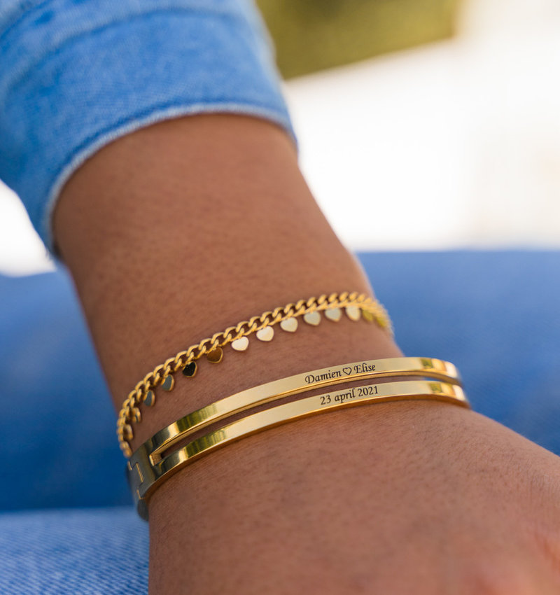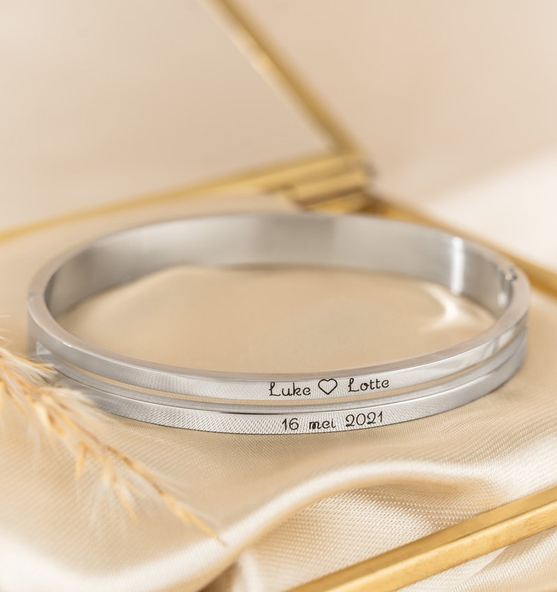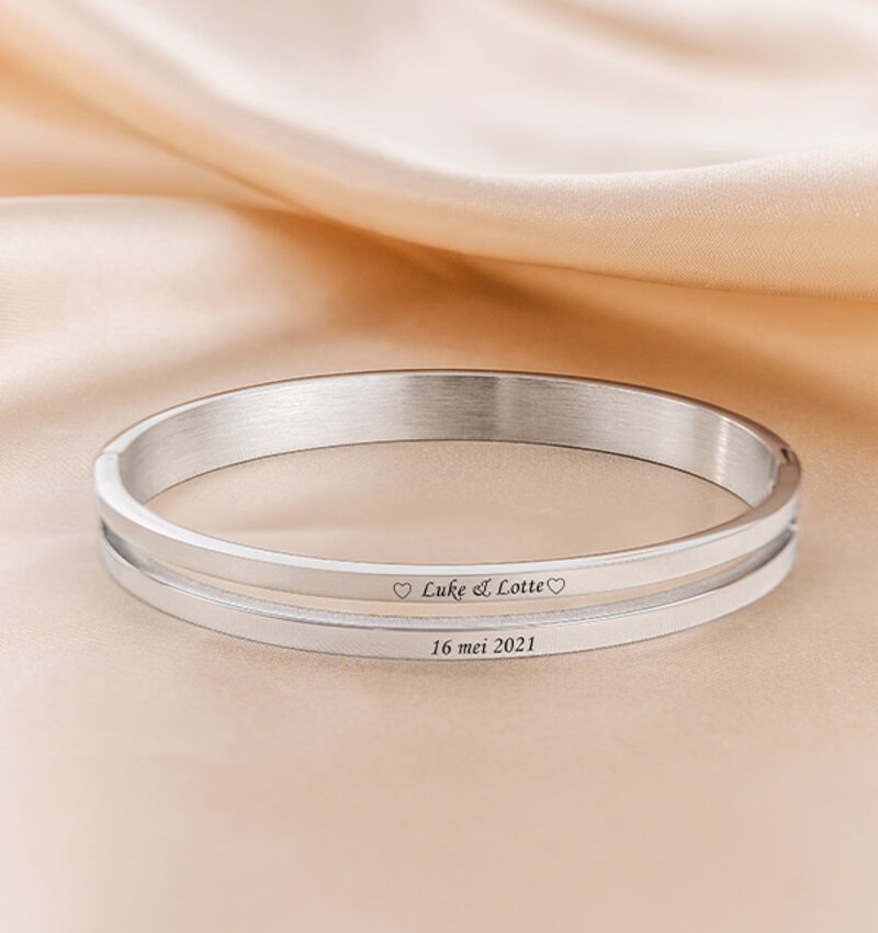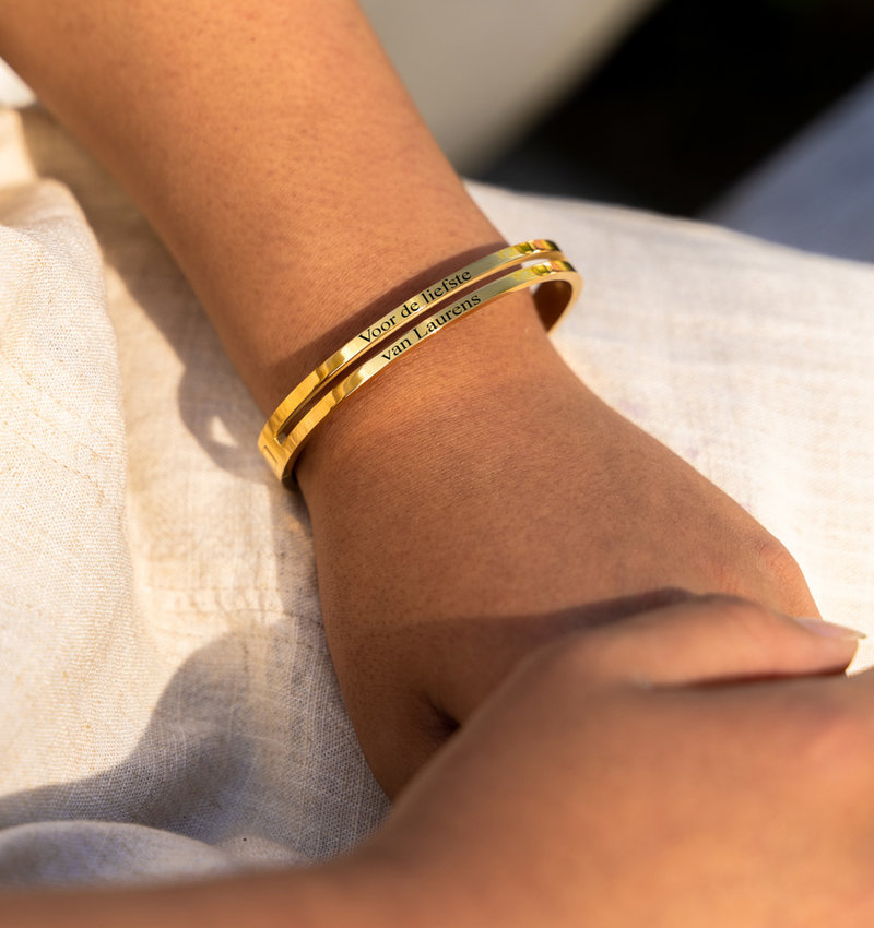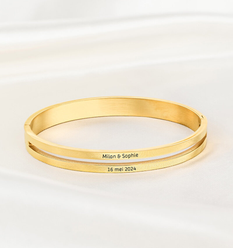 Dubbel zo mooi! Op deze dubbele bangle is genoeg ruimte voor een betekenisvolle gravure. Laat speciale woorden, namen, coördinaten of een lieve tekst op de armband graveren.