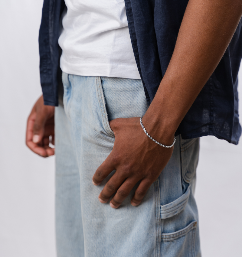 Deze stijlvolle herenarmband in zilver is gemaakt van topkwaliteit roestvrij staal dat niet verkleurt – een subtiele maar krachtige aanvulling op je look.